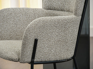 A szék vékony, kissé szűkülő fém lábai vizuális könnyedséget adnak a bútornak, miközben szilárd, biztonságos alátámasztást nyújtanak. A fekete váz szép kontrasztot alkot a világos kárpittal, kiemelve a szék minimalista, modern karakterét.